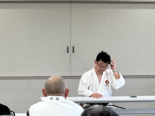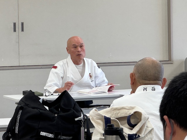 基本技の再確認や後の先,体の先,先の先を意識して同じ技を行ったりしました。講義では,「学び学ばせるのではなく,気付き気付かせる」という三柴先生の言葉に,責任ある立場の人はこれを意識しなければいけないと感じました。また,先月七段允可された須藤先生の特昇時の注意点を聞くことができ大変参考になりました。